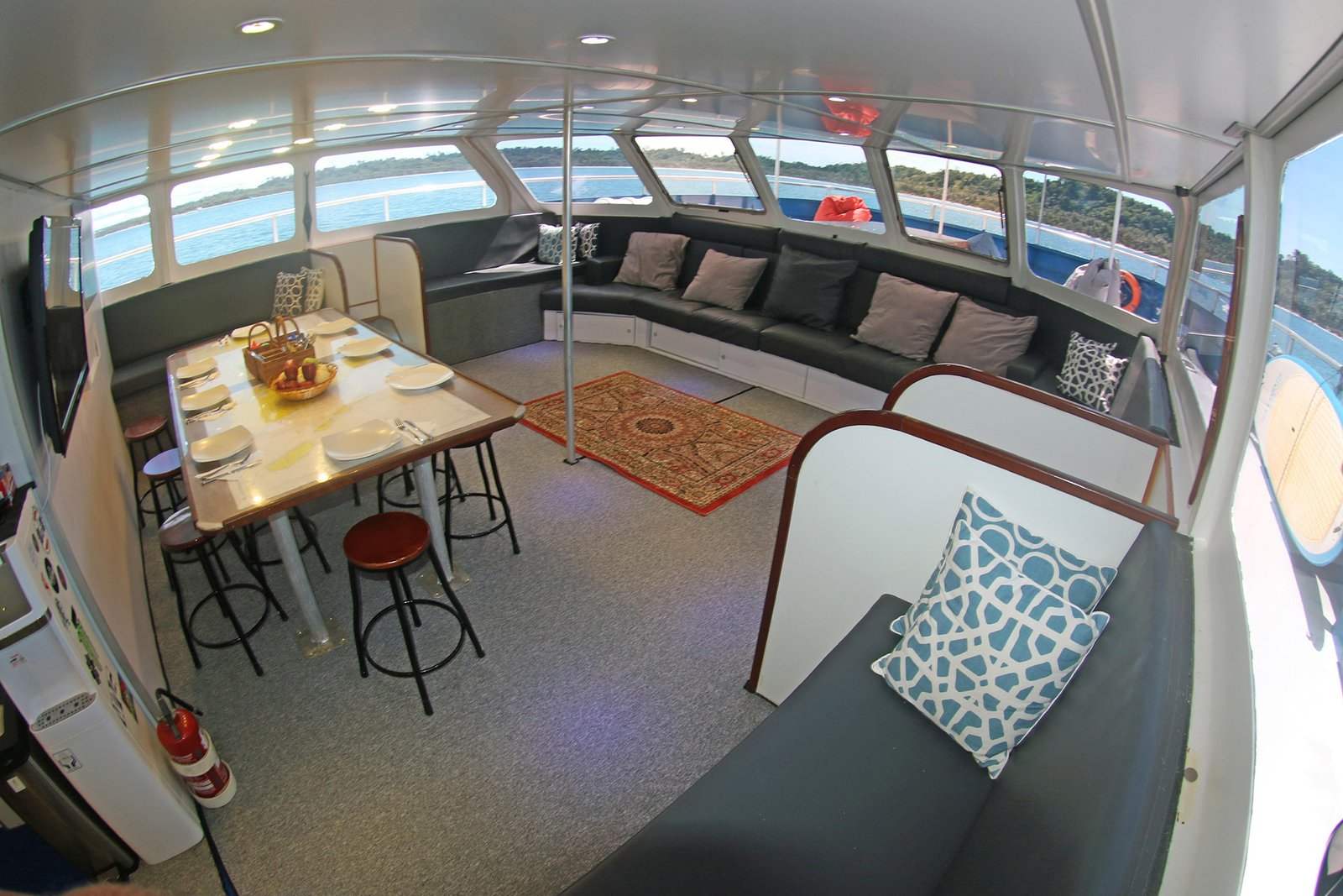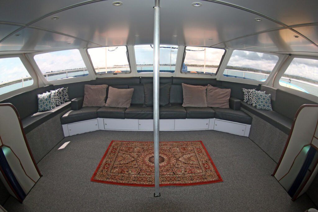 Powered by twin Hyundai Marine 260 HP main engines, the Sibon Baru offers smooth and efficient navigation, quickly taking you to the best surf breaks. For your entertainment and relaxation, we also have a 50-inch LCD TV, perfect for watching footage from your surf sessions or unwinding with a movie.