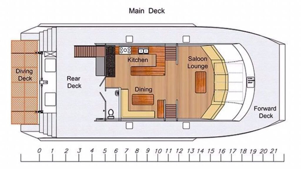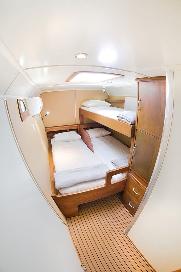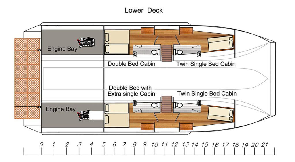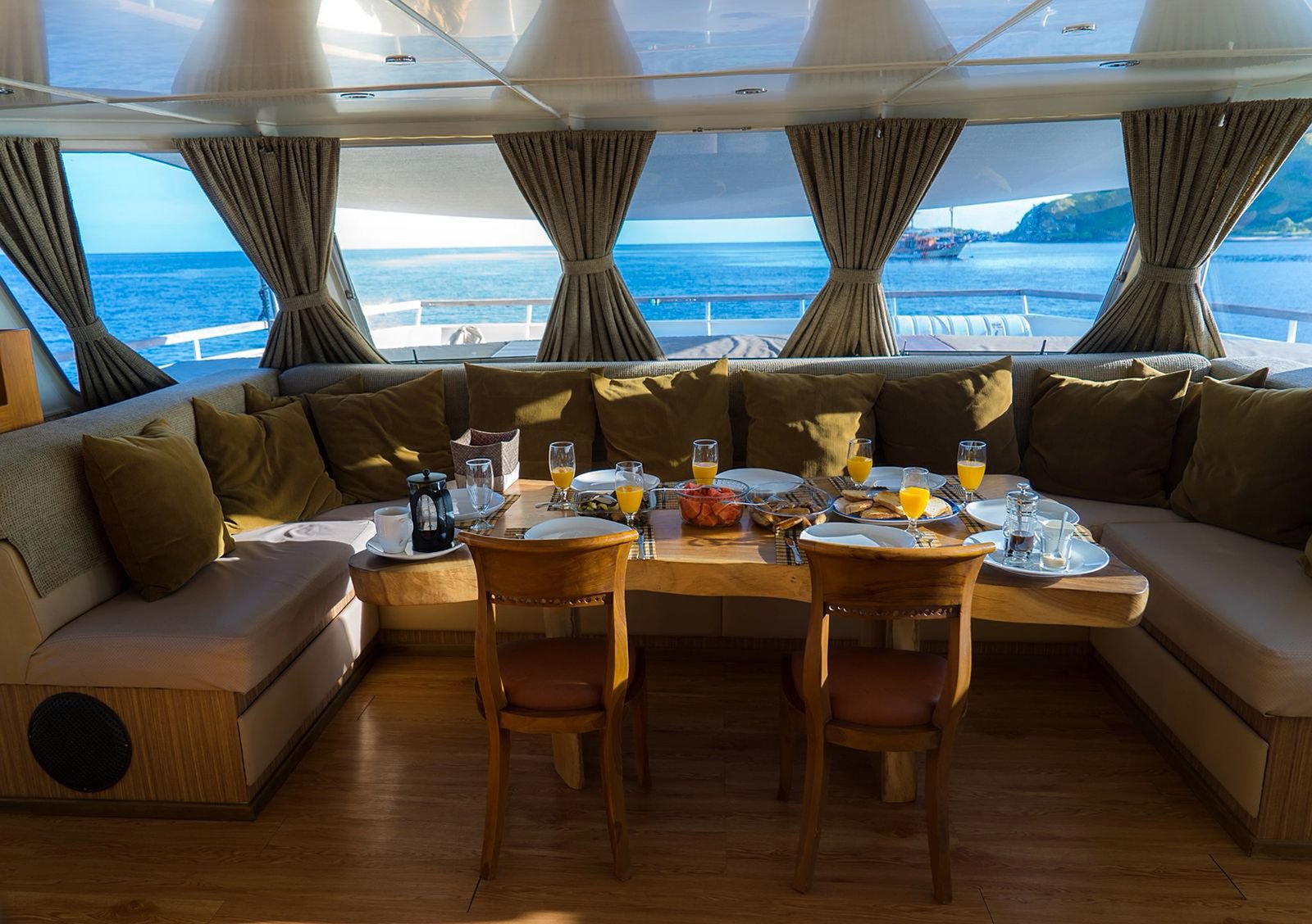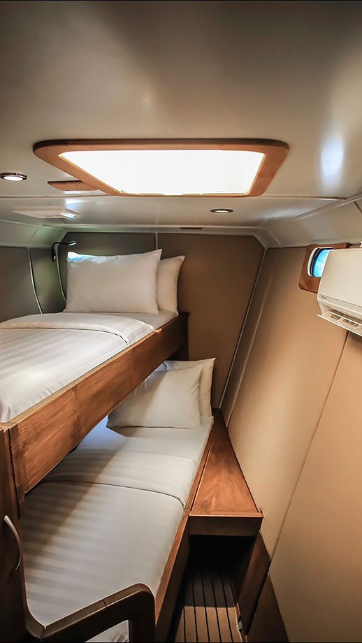 On board, you'll find four elegantly decorated private suites, plus a spacious additional cabin on the upper deck, offering privacy and comfort for all guests. All interior spaces are fully air-conditioned, providing a cool and refreshing retreat in any tropical climate.